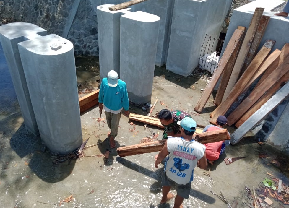 Kulon Progo. Serda Edi Susilo, Babinsa Tayuban, Koramil 10/Panjatan, Kodim 0731/Kulon Progo, bersama beberapa warga melaksanakan pemasangan skot pintu air, yang berada di Sungai Hizero. depan SLB Negeri I Kecamatan Panjatan. Selasa (10/12/2019)